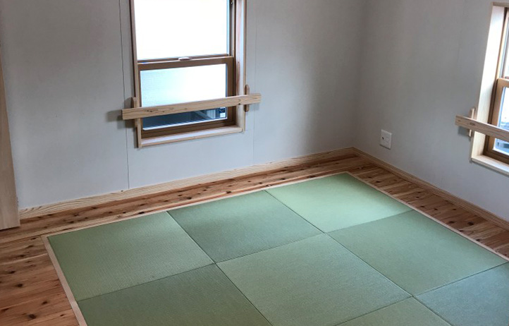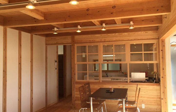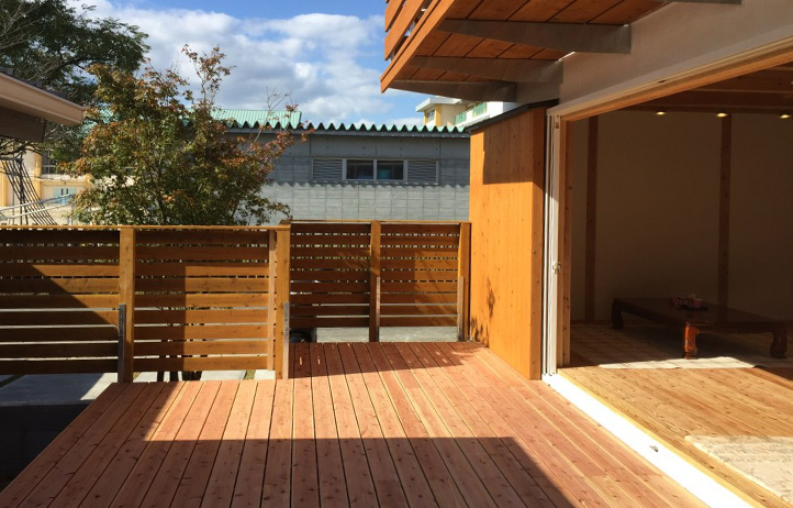 ひときわ目を引く大きな緑の木のガレージには家族のこだわりが詰まっています。ふた部屋の土間の片方には、パパイチオシのミニキッチンとカウンターを設置。おもてなしや雨の日の趣味にとても便利です。ここからあちこち行き来でき、リビングから続くウッドデッキは自然と人が集まる憩いの場所に。キッチンの木枠ガラスの縦引戸は、奥様のご要望。遊び心と機能性を兼ね備えた邸宅です。